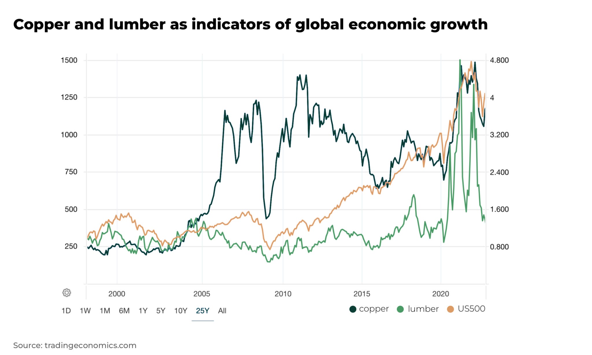 Copper is widely regarded as a indicator of global economic growth due to its use in everything from construction to power and transmission, transportation to electronic manufacturing. When the copper price begins to fall, so concerns over the economy rise. There are similarities with lumber and the US housing market.